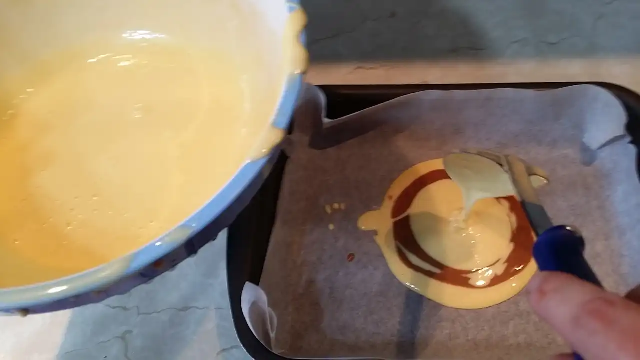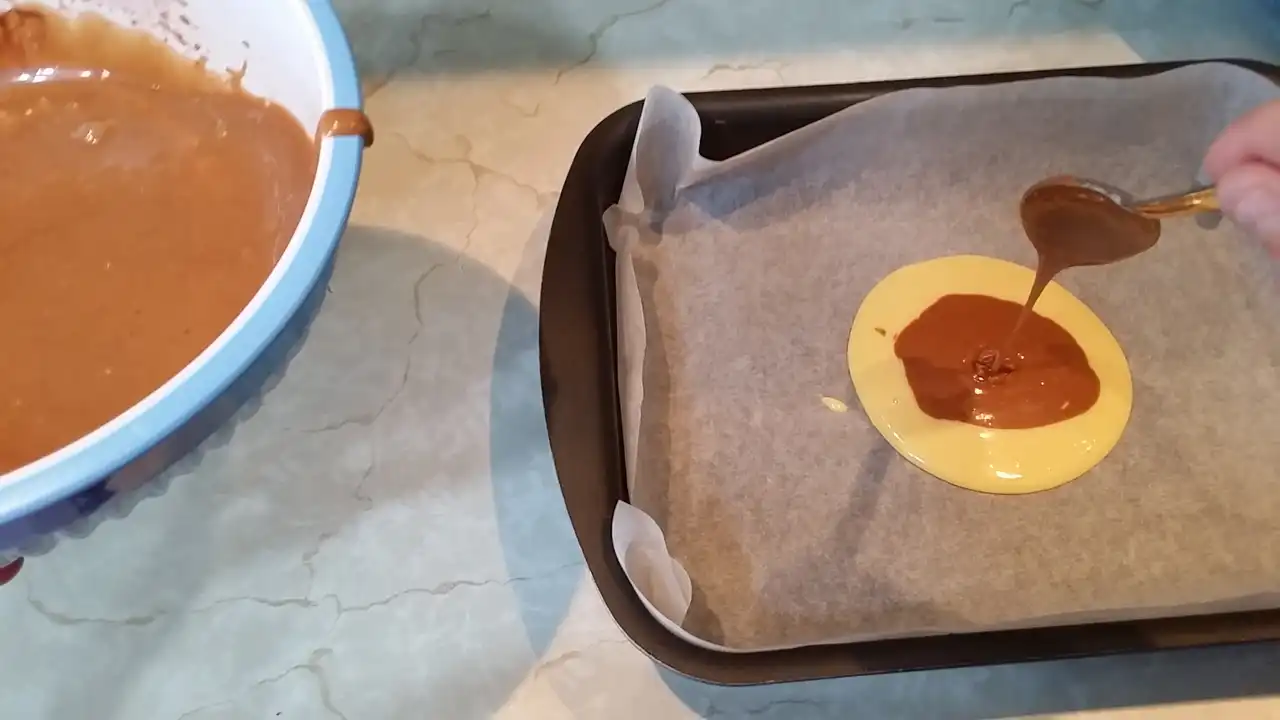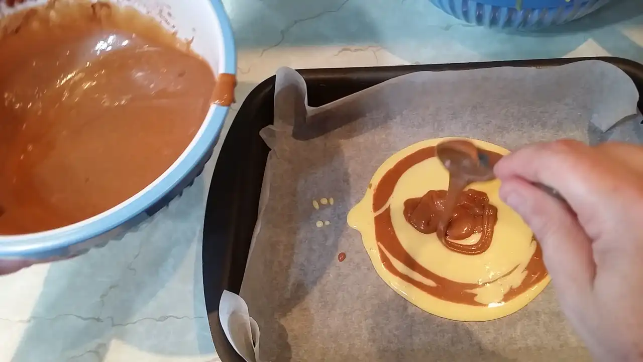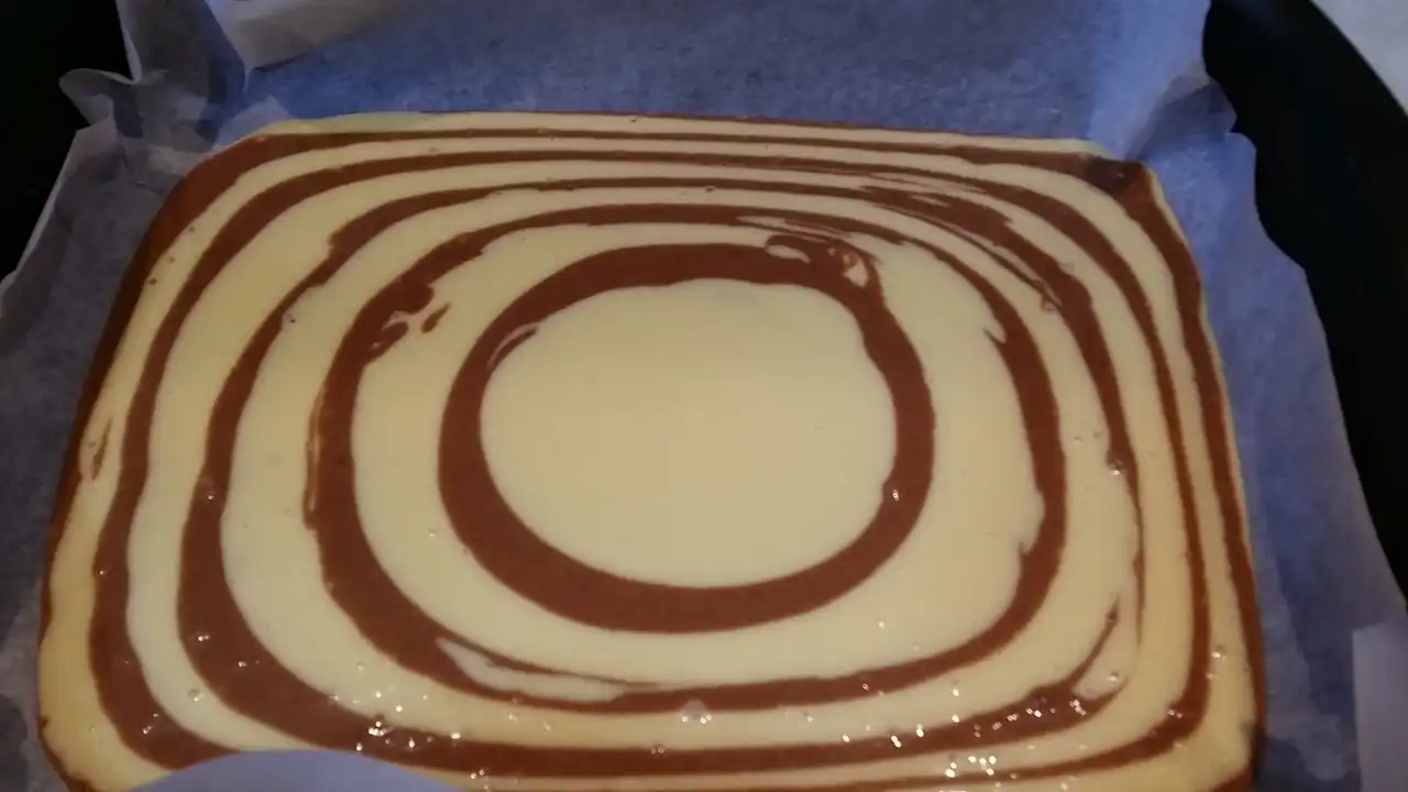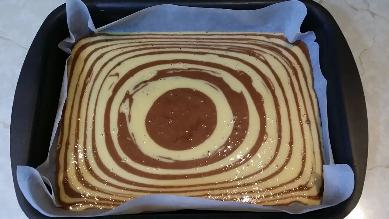 Testo sam podelila na dva dela – u jedan sam dodala čokoladu u prahu, da dobijem onu prepoznatljivu mramornu šaru, a drugi deo ostavila svetao. Sada dolazi zabavni deo: u pleh sa papirom za pečenje naizmenično sam kašikom stavljala po jednu kašiku svetle i tamne smese, praveći šare koje izgledaju kao da ih je radio umetnik. I da, dok sam to radila, pomislila sam: “Ako ovo ne uspe, bar ću imati lep apstraktni kolač.”