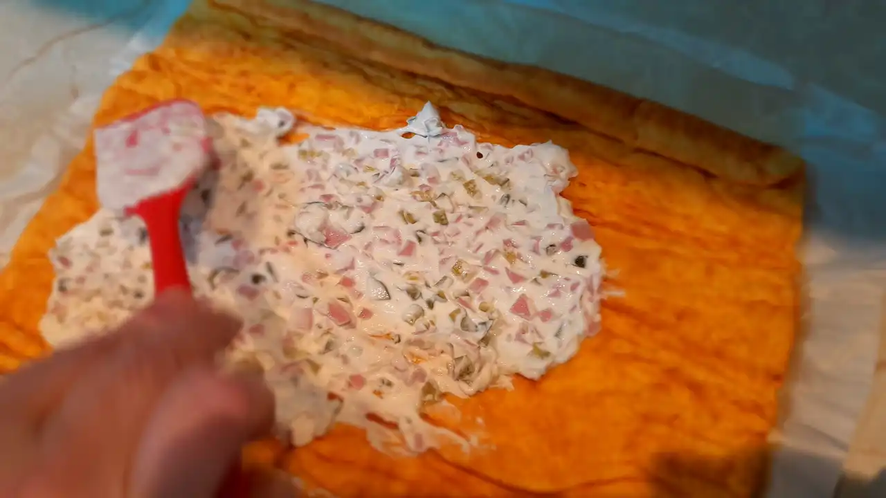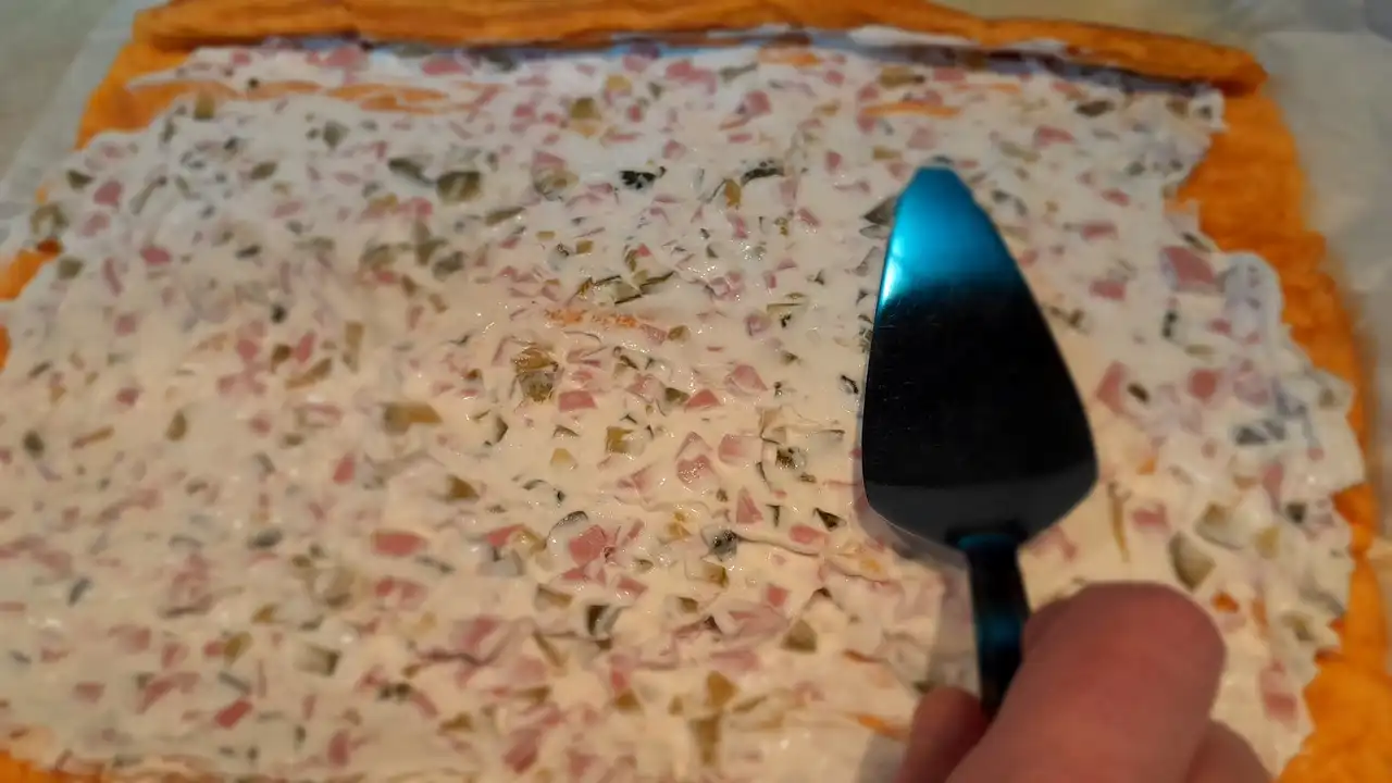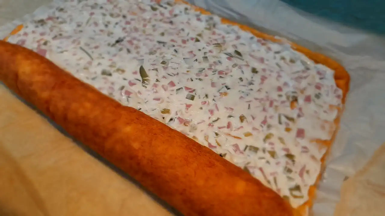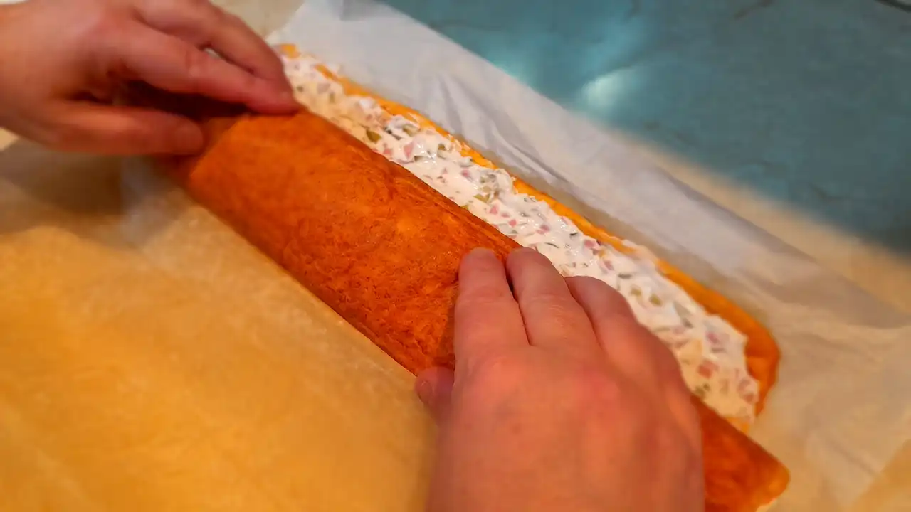 Bundeva je kraljica ovde, daje tu narandžastu mekoću koja se topi u ustima, dok kremasti sir i kisela pavlaka donose baršunastu nežnost. Salama,ili šunka dodaje dimljeni šarm, a kiseli krastavci tu hrskavu iznenađenost koja čini svaki zalogaj avanturom. Sve se lepo slaže u 12 porcija, gotovo za tren oka – idealno kad gosti lupaju na vrata, a ti samo smeješ se u sebi: „Eto, slani rolat sa bundevom je spreman!“